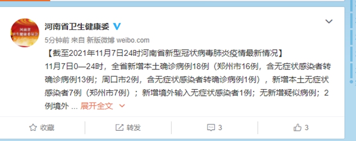 11月7日0—24时,河南省新增本土确诊病例18例(郑州市16例,含无症状感染者转确诊病例13例;周口市2例,含无症状感染者转确诊病例1例),新增本土无症状感染者7例(郑州市7例);新增境外输入无症状感染者1例;无新增疑似病例;2例境外输入确诊病例治愈出院,1例境外输入无症状感染者解除医学观察。