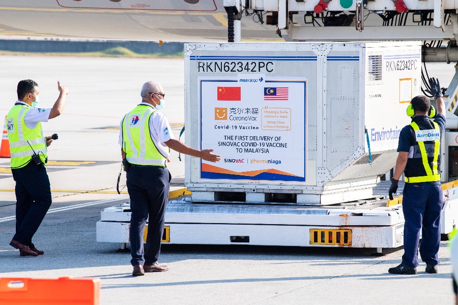 2月27日,马来西亚向中国科兴公司订购的首批新冠疫苗抵达吉隆坡国际机场。(新华社记者朱炜摄)