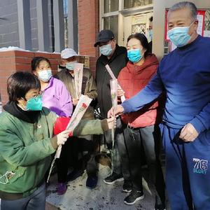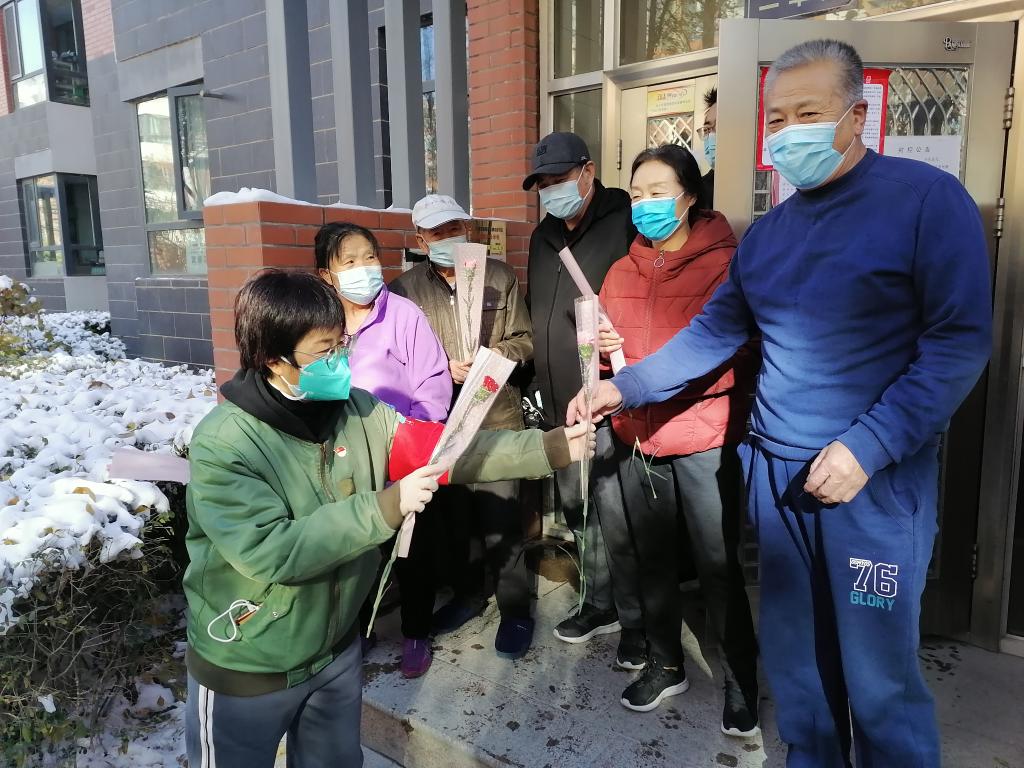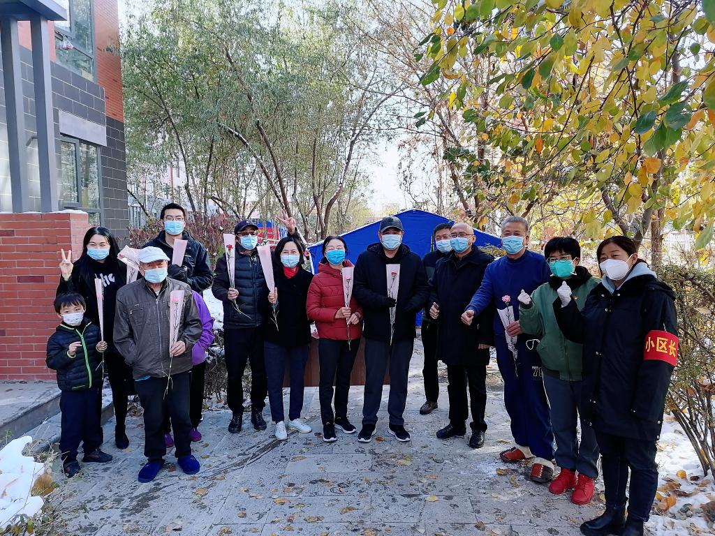 在银川市金凤区长城花园社区,工作人员为解除管控的居民送上鲜花。(受访者供图)