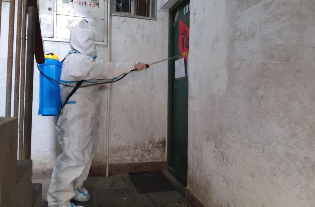 在银川市兴庆区北关社区,工作人员对即将解除管控的单元进行楼内环境消杀。(受访者供图)