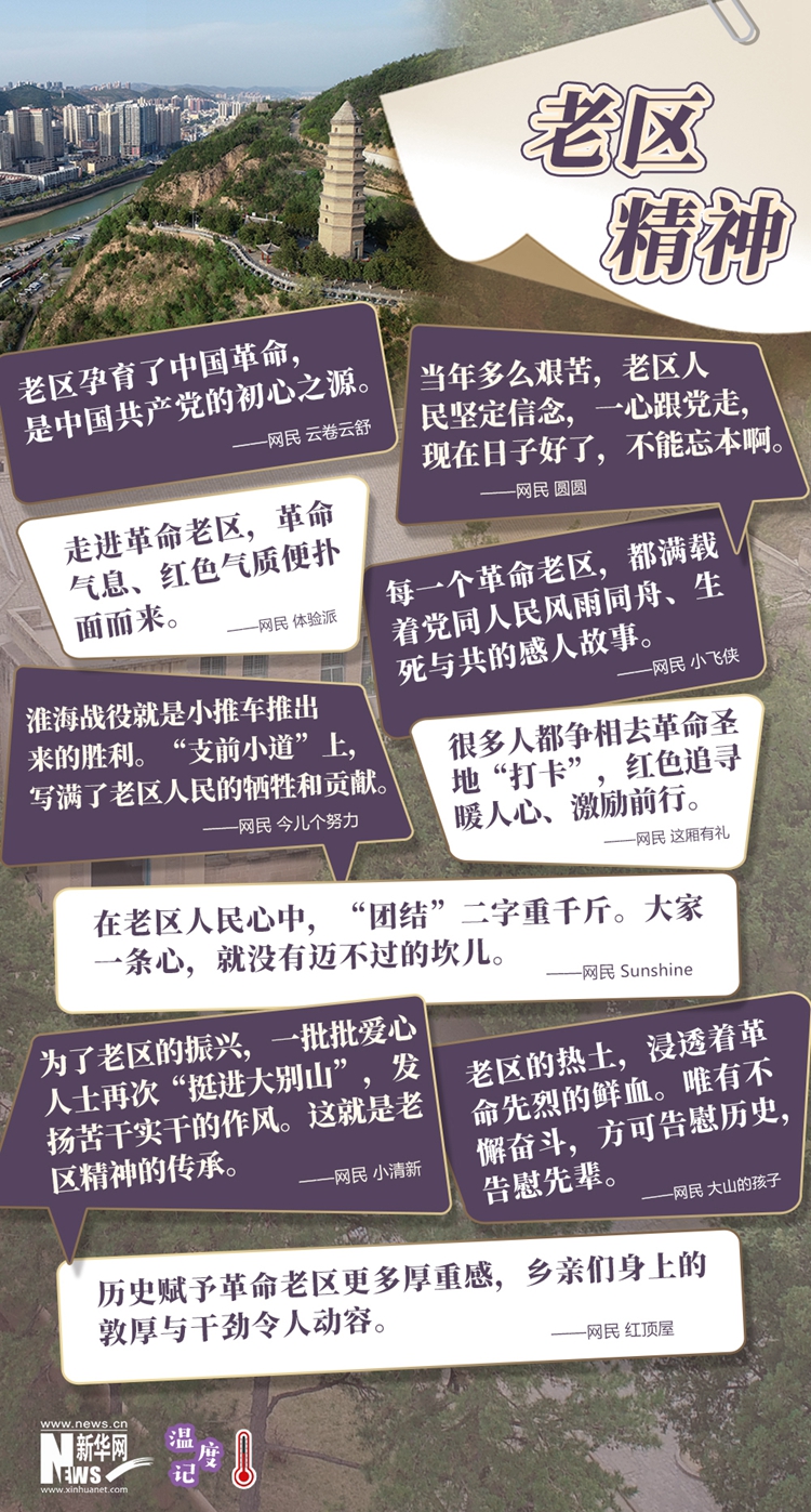 时空更迭,精神永恒。每次走进革命老区,重温一段段峥嵘岁月,我们都会被老区人民的坚韧和自强震撼,受到老区精神的洗礼。“老区的热土,浸透着革命先烈的鲜血。唯有不懈奋斗,方可告慰历史,告慰先辈”,正如网民所说,回望过往历程,眺望前方征途,我们要永远记住老区和老区人民的付出,赓续红色血脉,发扬伟大精神,用光荣传统和优良作风坚定信念、凝聚力量,用历史经验和实践创造启迪智慧、砥砺品格,饮水思源不忘本,继往开来向前进。(文字:马若虎 海报设计:王晔)