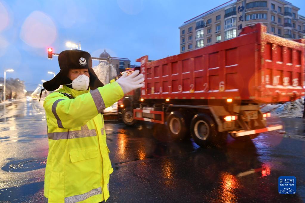 11月8日,在哈尔滨市平房区,一名辅警在冻雨中指挥交通。