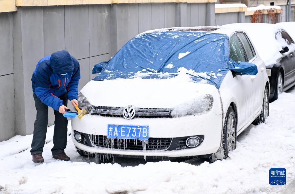 11月8日,长春市民清理被“冰冻”的汽车。新华社记者 颜麟蕴 摄