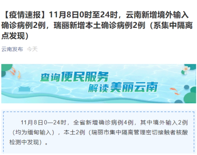 11月8日0—24时,云南省新增确诊病例4例,其中境外输入2例(均为缅甸输入),本土2例(瑞丽市集中隔离管理密切接触者核酸检测中发现)。