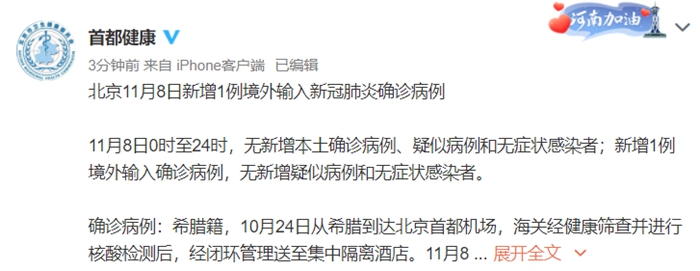 确诊病例:希腊籍,10月24日从希腊到达北京首都机场,海关经健康筛查并进行核酸检测后,经闭环管理送至集中隔离酒店。11月8日报告核酸检测结果为阳性,转至定点医院,综合流行病史、临床表现、实验室检测和影像学检查等结果,当日诊断为确诊病例,临床分型为普通型。