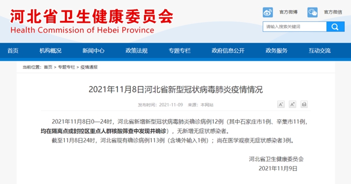 2021年11月8日0—24时,河北省新增新型冠状病毒肺炎确诊病例12例(其中石家庄市1例、辛集市11例,均在隔离点或封控区重点人群核酸筛查中发现并确诊),无新增无症状感染者。