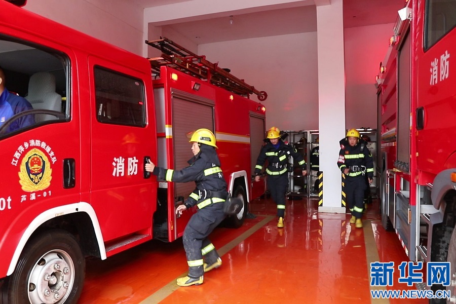 “叮叮叮……”11月7日一早,警报声突然响起,消防员黄乐喜和队友们不到一分钟就冲下楼换好服装登车出发,赶赴救援现场。新华网发 王强 摄