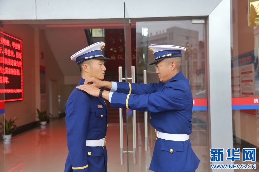 火焰蓝,是消防员的象征色。26岁的黄乐喜是江西省萍乡市芦溪县迎宾大道消防救援站消防员,也是一名退伍军人。出于职业崇拜和向往,2019年退伍后,黄乐喜选择成为一名消防员。图为黄乐喜(左)在队友帮助下整理制服。新华网发 王强 摄