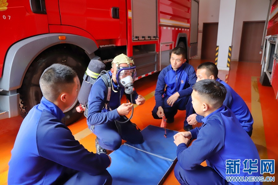 “刚刚加入消防队伍的时候感觉很不习惯。”黄乐喜说,但得益于队友们的关心照顾和手把手教学,自己进步迅速。图为黄乐喜(左三)正在和队友们进行技能学习。新华网发 王强 摄