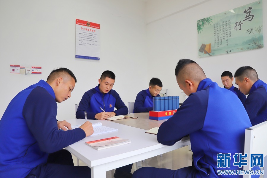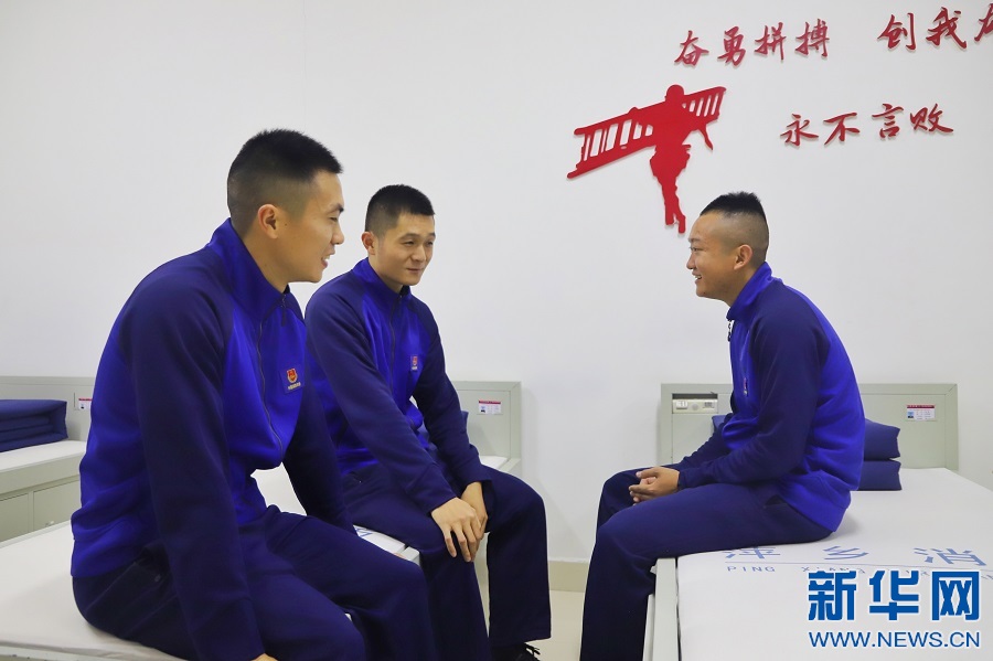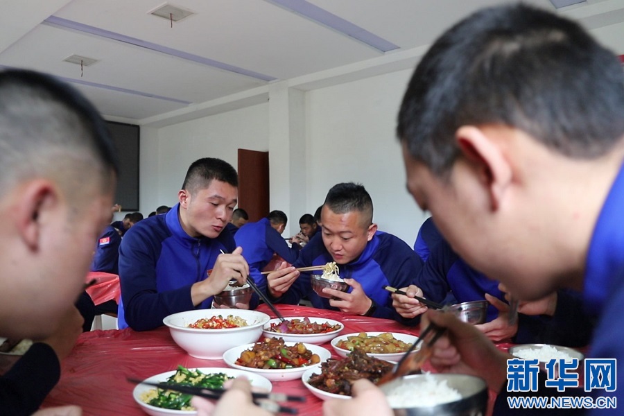 消防员一年中大多数时间都吃住在队里,与家人聚少离多是常态。“刚开始感觉特别累,特别辛苦,后面习惯了之后就感觉还好。”黄乐喜说。图为黄乐喜(左二)和队友们正在食堂就餐。新华网发 王强 摄