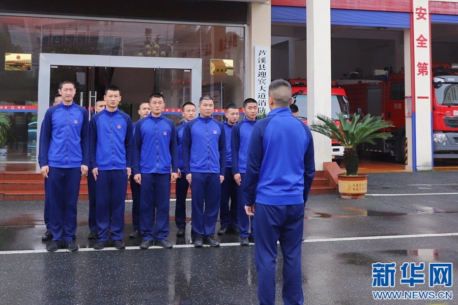 作为消防员,黄乐喜和队友们要做到24小时随时待命。电铃一响就赶紧冲,已经成为黄乐喜和队友们的一种本能反应。图为黄乐喜(左三)和队友们正在列队。新华网发 王强 摄