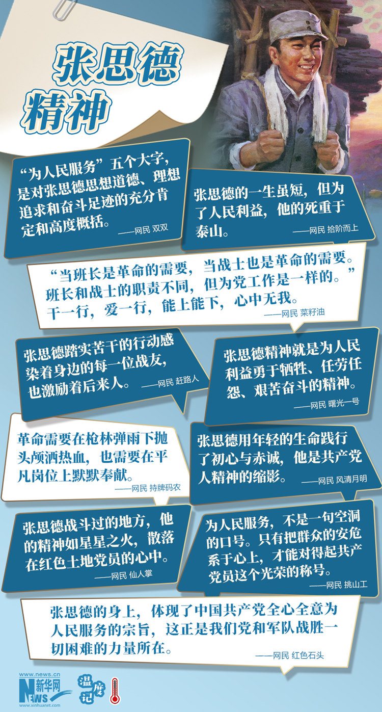 “张思德精神就是为人民利益勇于牺牲、任劳任怨、艰苦奋斗的精神”,社交平台上,网民们表达着对革命先辈的致敬,从他身上汲取奋进的动力。正如留言中说的那样,我们党来自人民、植根人民、服务人民,党的根基在人民、血脉在人民、力量在人民。无论是革命战争年代,还是和平建设时期,正是因为把“全心全意为人民服务”作为一切工作的出发点和落脚点,我们党才能保持同人民群众的血肉联系,才能团结带领人民战胜一个又一个艰难险阻,创造一个又一个人间奇迹。前进路上,我们要始终把党“全心全意为人民服务”的根本宗旨铭记于心、践之于行,不断凝聚智慧和力量,继续创造出无愧于党、无愧于人民、无愧于时代的新的辉煌。(文字:徐可 海报设计:王晔)
