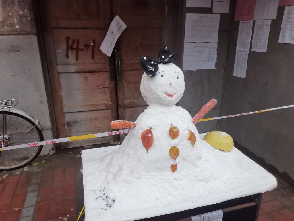 “因为下雪,帐篷里比较冷,我们几个就动手堆雪人热热身。为了让雪人好看点,我们还找来柚子皮给它当帽子,还给它戴上自己的蝴蝶结。”曹雪说,她负责两个封控单元的消杀工作,并且还要给住户送快递、收垃圾。刚当志愿者时,她经常要值守24小时,现在人员逐渐充足,她每天只需值守5个小时。