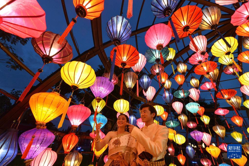 11月8日,游客在泰国北榄府举行的国际灯笼美食节预展活动上观赏灯笼。