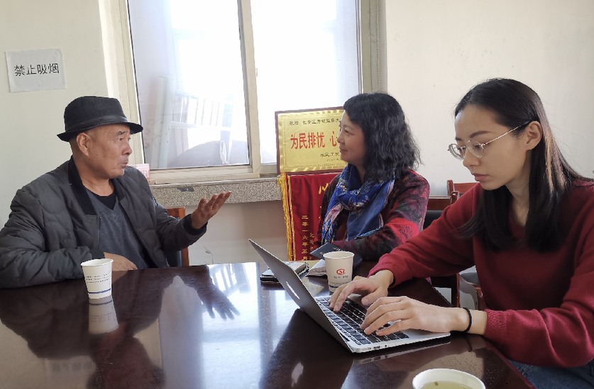新华社记者林红梅(中)在石家庄市长安区劳动监察大队调解室采访农民工讨薪