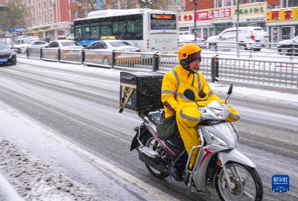吉林省长春市的一名外卖配送员冒雪配送餐品(11月9日摄)。