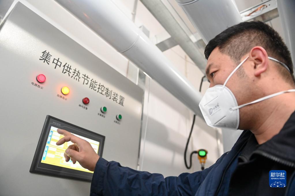 长春市热力集团工作人员张海涛在换热站检查供热管道(11月9日摄)。