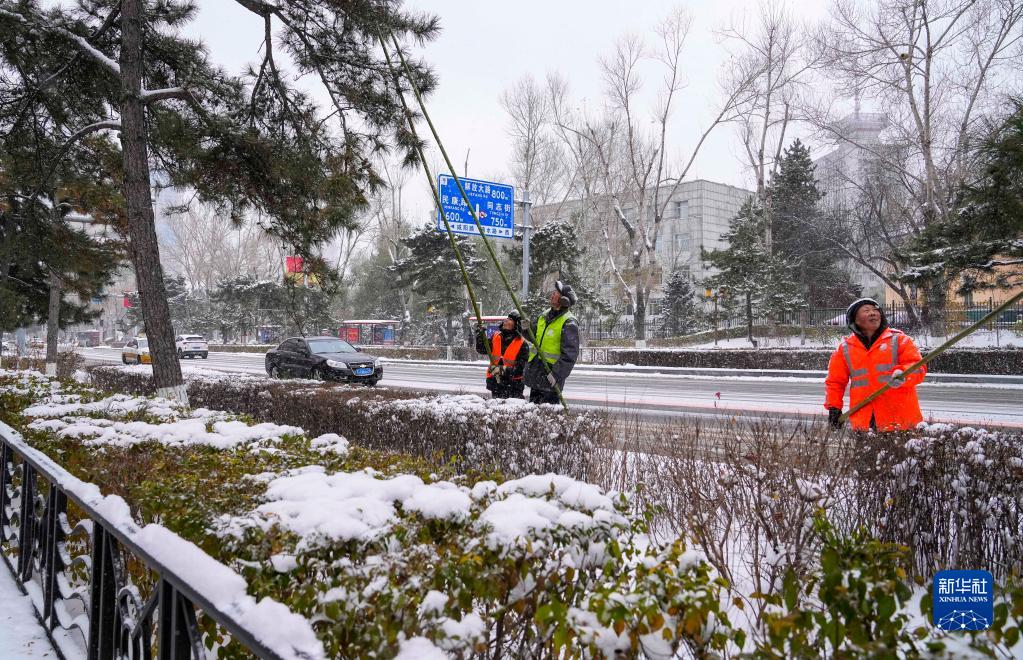 长春市绿化管理中心职工清理树上积雪(11月9日摄)。