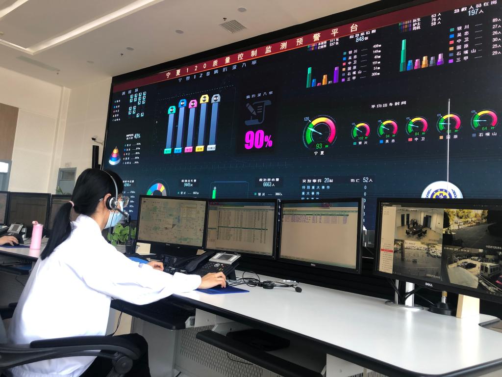 银川市紧急救援中心调度员正在接听急救电话。新华社记者艾福梅摄