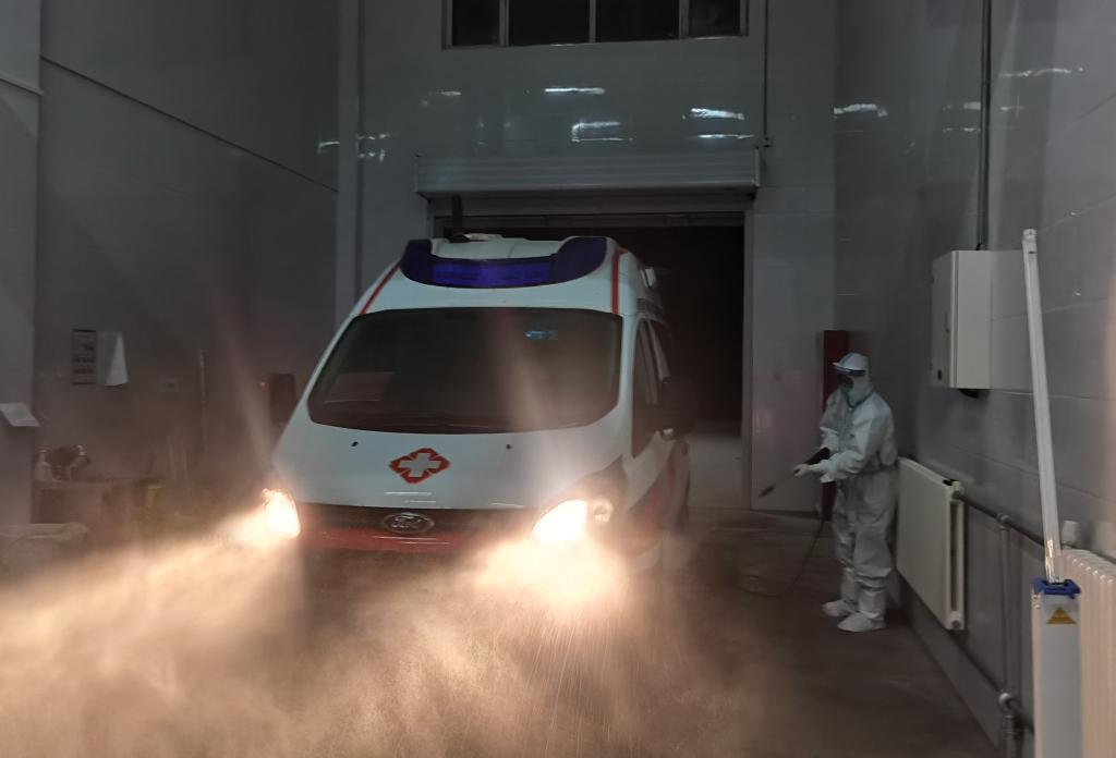 银川市紧急救援中心急救人员对救护车进行消杀。受访者供图