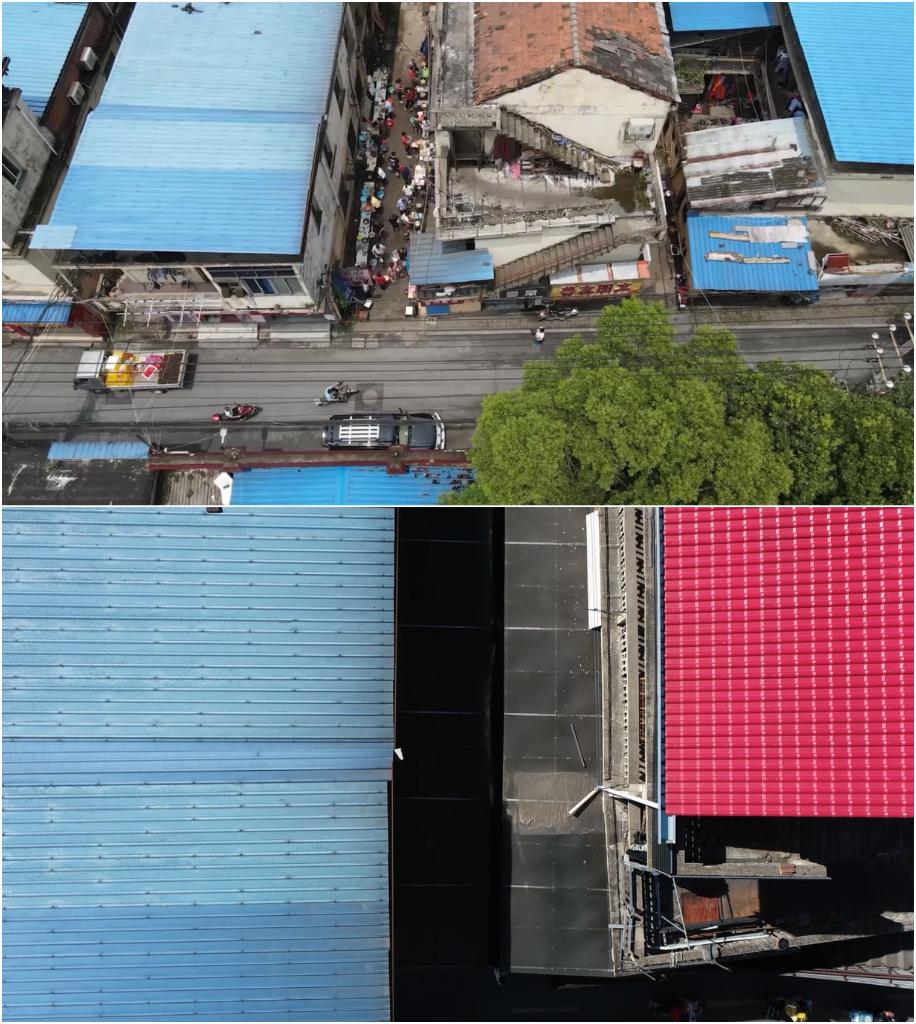 这是一张拼版图片。上图是改造前的“抗癌厨房”,没有顶棚;下图是改造后的“抗癌厨房”,已经支起透明的顶棚。新华社记者胡晨欢制作