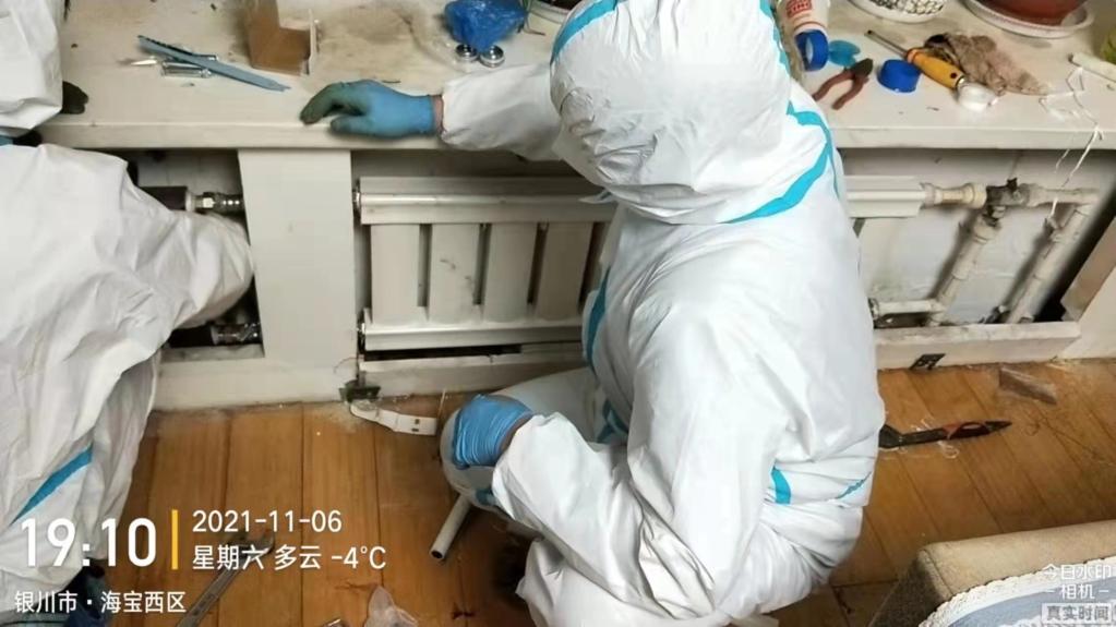 疫情管控区域居民遇到较为复杂的用热问题时,供热企业工作人员在做好防护的情况下入户维修。(受访者供图)