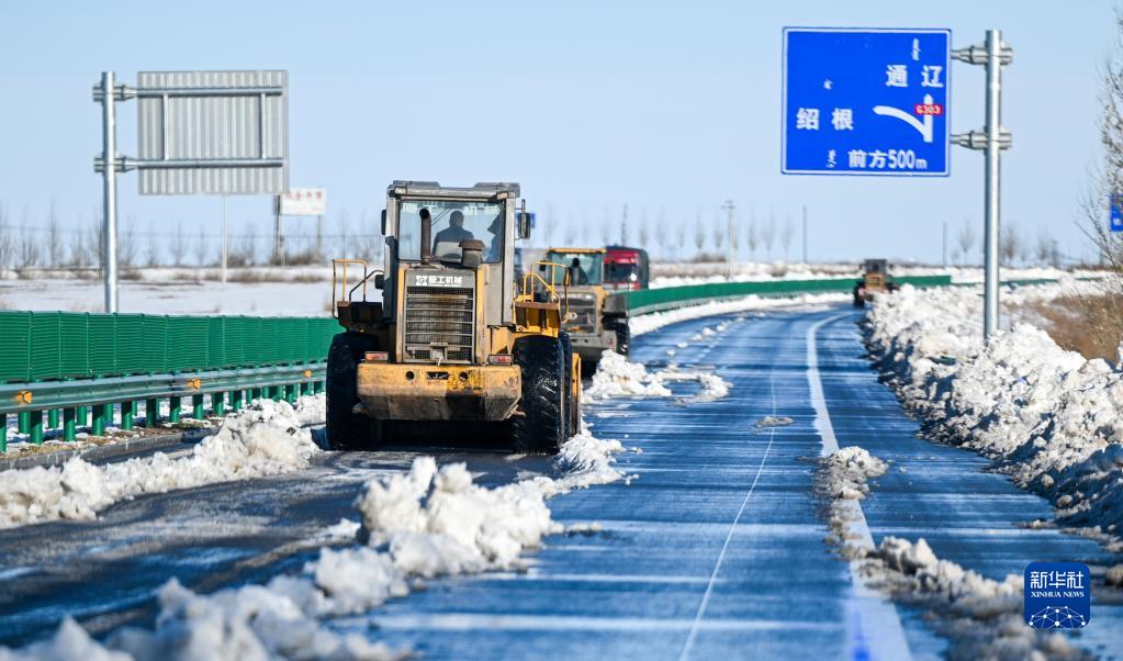 11月10日,在内蒙古赤峰市303国道上,作业车辆清理积雪。 新华社记者 连振 摄