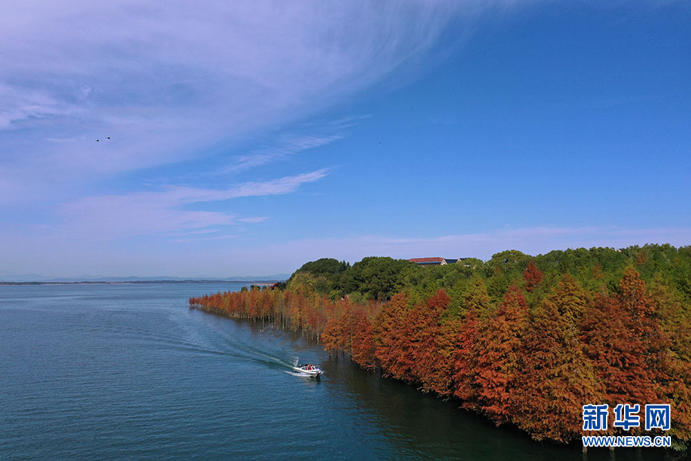 图为初冬时节,荆门漳河水库杉林美景。新华网发 彭琦摄