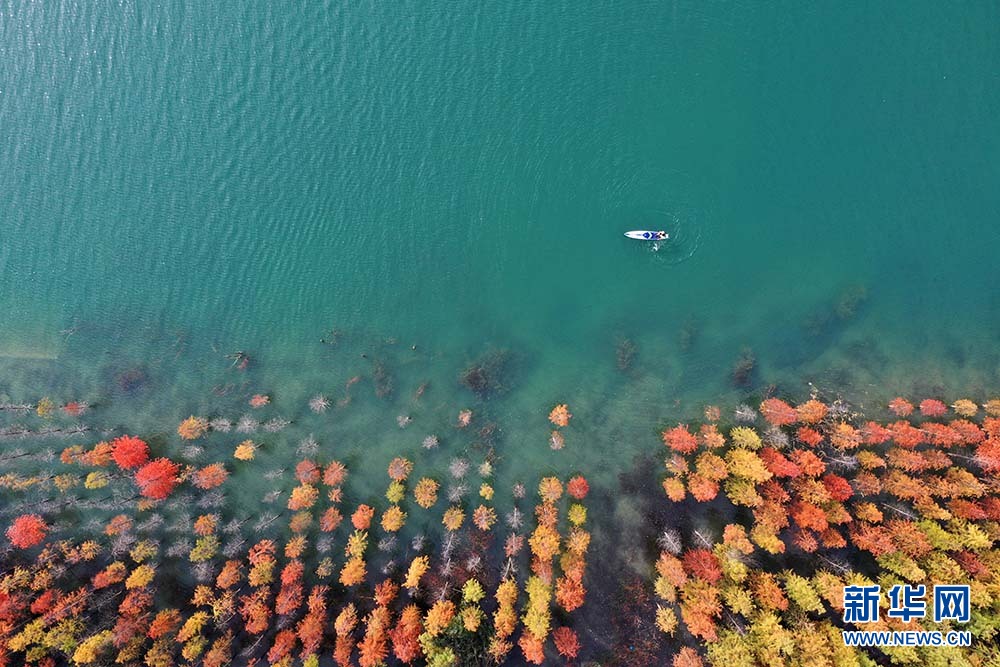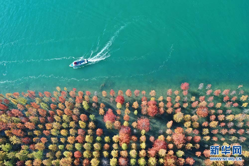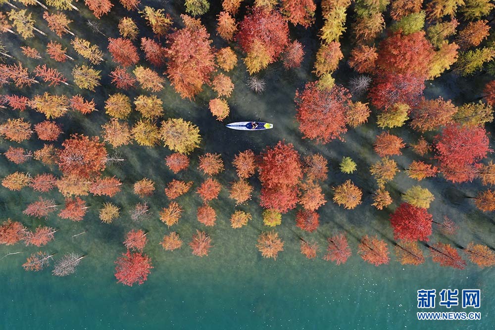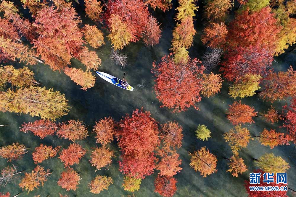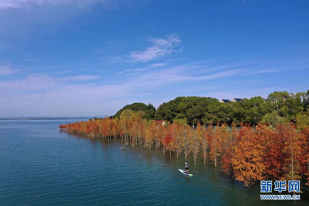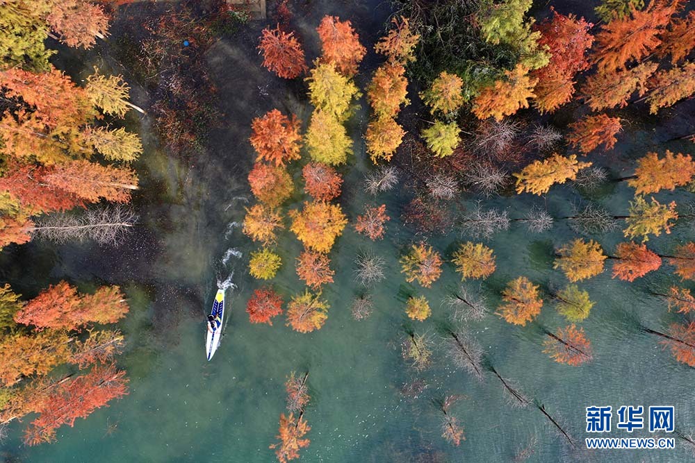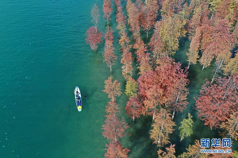 初冬时节,湖北荆门漳河水库大片杉林换上斑斓新装,红绿相间,映照着碧水。一群桨板运动爱好者被吸引前来,或激情竞渡,或穿梭林间,沉醉在美如画卷的自然景色中。(余凌云)