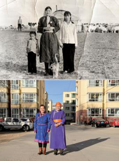 上图:拼版照片,上为年轻时的都贵玛(中)和家人在他们居住的蒙古包前合影。下为2018年,76岁的都贵玛(右)和女儿查干朝鲁(左)在自家楼下合影。新华社资料片