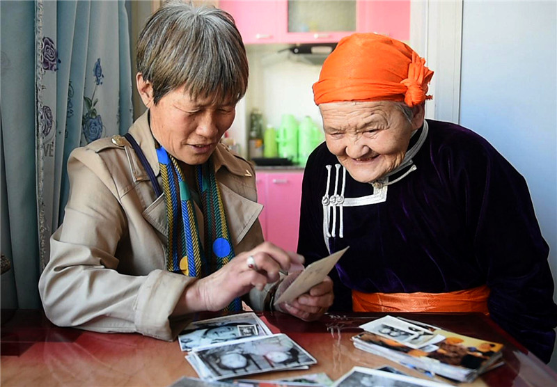 “草原母亲”都贵玛(右)和她抚养过的斯日巴勒在一起翻看照片(5月10日摄)。新华社记者 任军川 摄