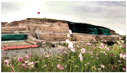发掘中的石峁遗址金字塔式建筑皇城台(9月12日摄,无人机照片)。新华社记者陶明摄