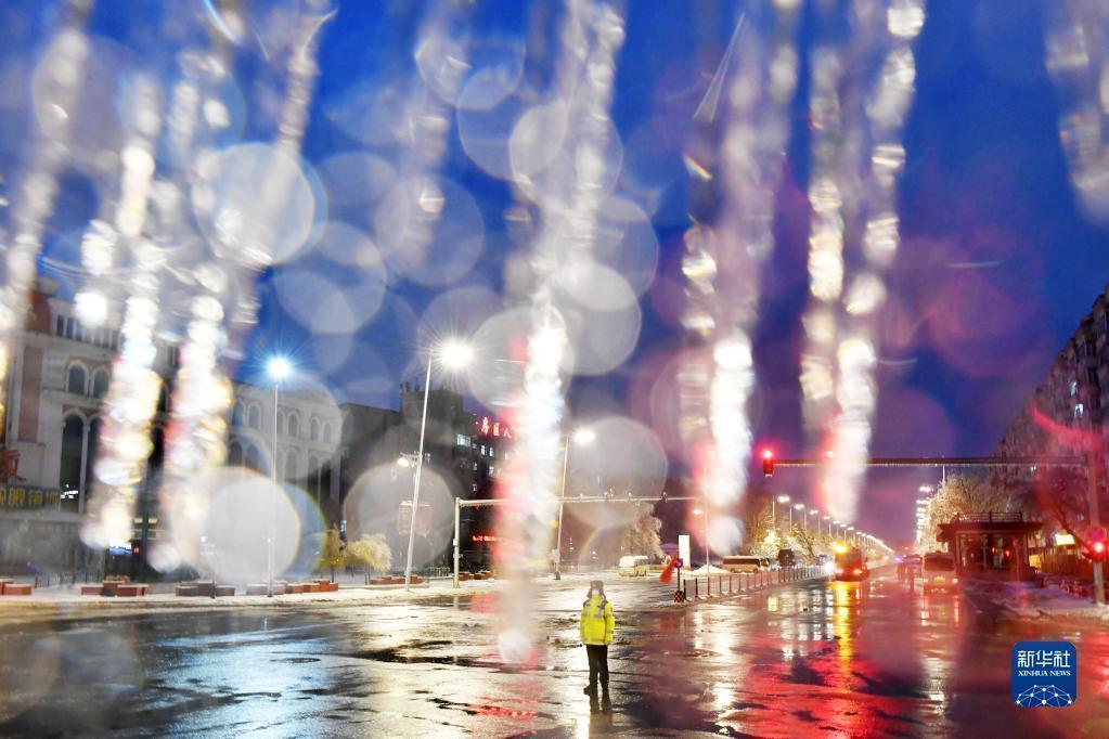 11月8日,在哈尔滨市平房区,一名交通辅警在冻雨中指挥交通。新华社记者 王建威 摄