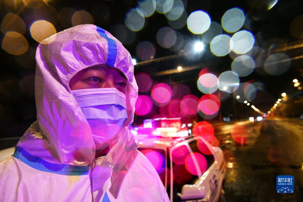 11月8日,在哈尔滨市平房区一进出城卡点,一名公安人员在冻雨中执勤。新华社记者 王建威 摄