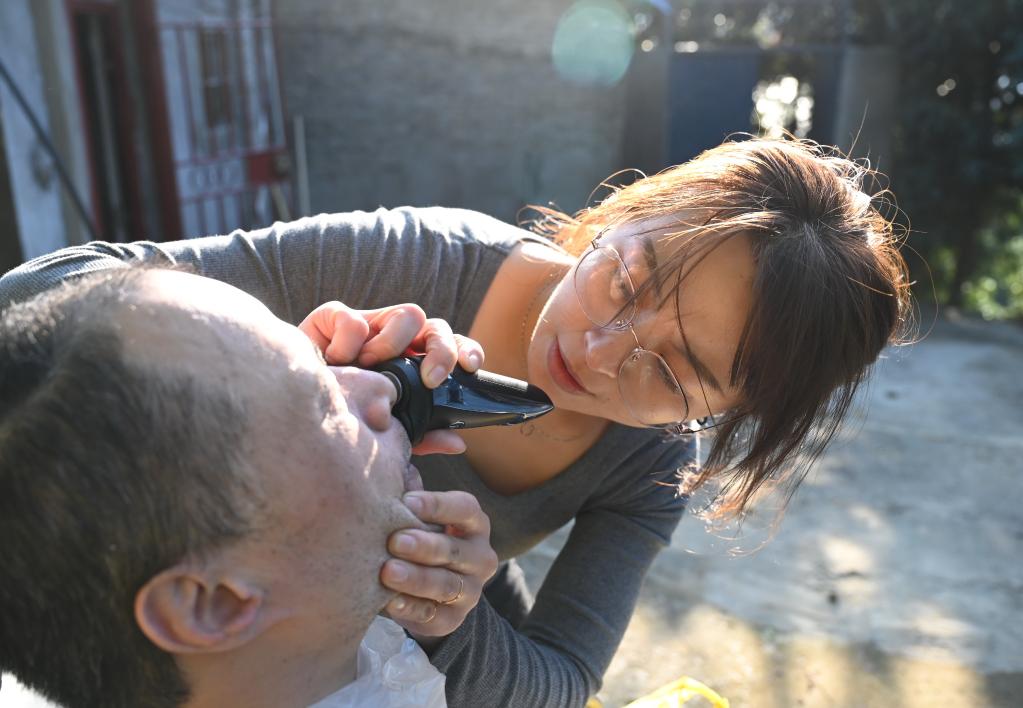 黄思林给爸爸剃胡须。新华社记者林善传 摄