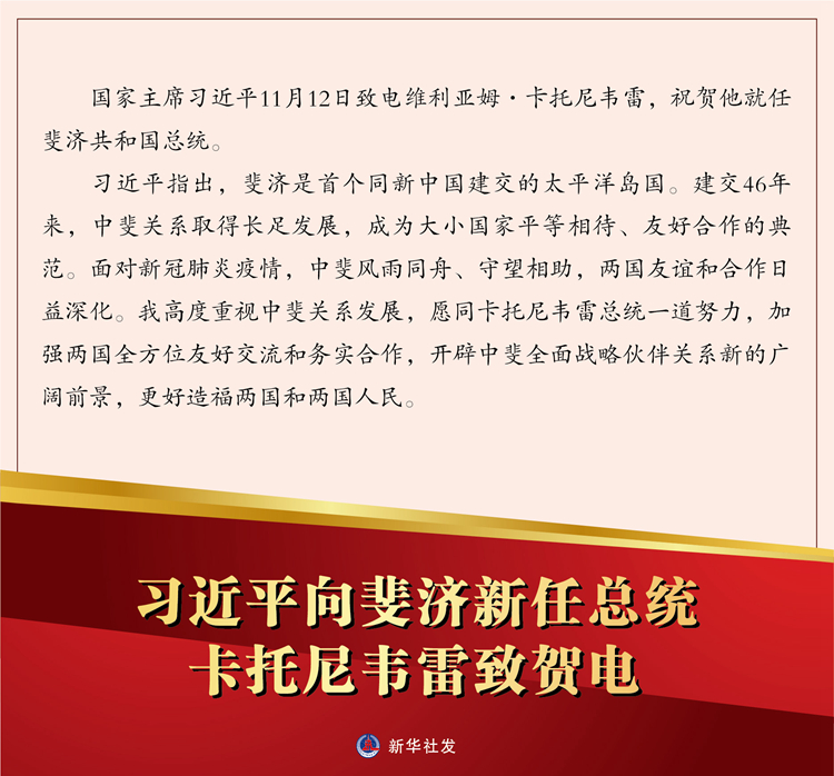 新华社北京11月13日电 国家主席习近平11月12日致电维利亚姆·卡托尼韦雷,祝贺他就任斐济共和国总统。