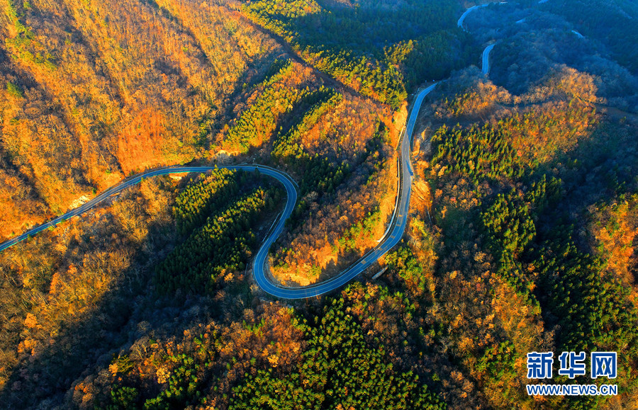 11月13日,地处大别山腹地的安徽省六安市金寨县马鬃岭层林尽染,蜿蜒曲折的盘山公路掩映在五彩斑斓的崇山峻岭之中,冬景如画,美不胜收。新华网发(王闽 摄)