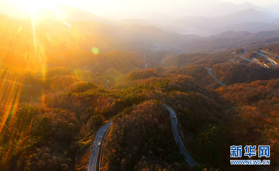 无人机航拍马鬃岭蜿蜒曲折的盘山公路。新华网发(王闽 摄)