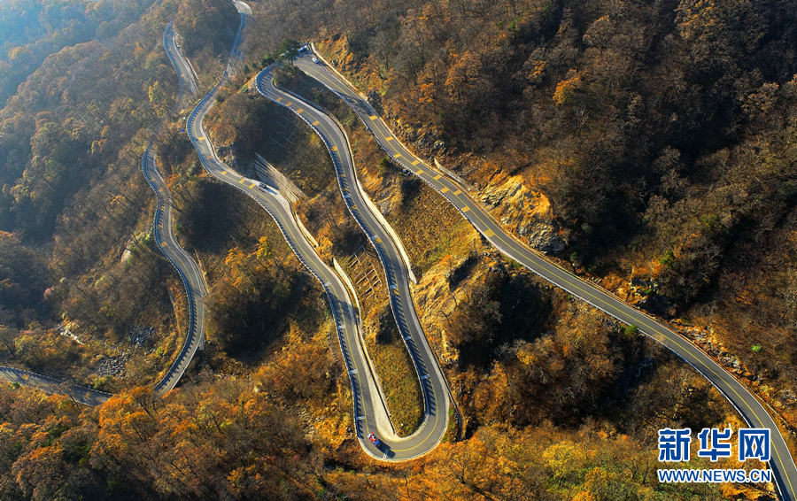无人机航拍马鬃岭蜿蜒曲折的盘山公路。新华网发(王闽 摄)