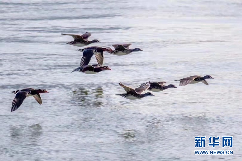 近日,在湖北宜昌葛洲坝以下长江江段,摄影爱好者杨河在捕捉江豚戏水画面时,拍到了一群特殊的“客人”。经辨认,这些雌雄异色的水鸟正是国家二级保护动物鸳鸯,这也是近年来首次发现鸳鸯群聚集宜昌城区江面。(刘桔、张甜甜、陈雅丹)