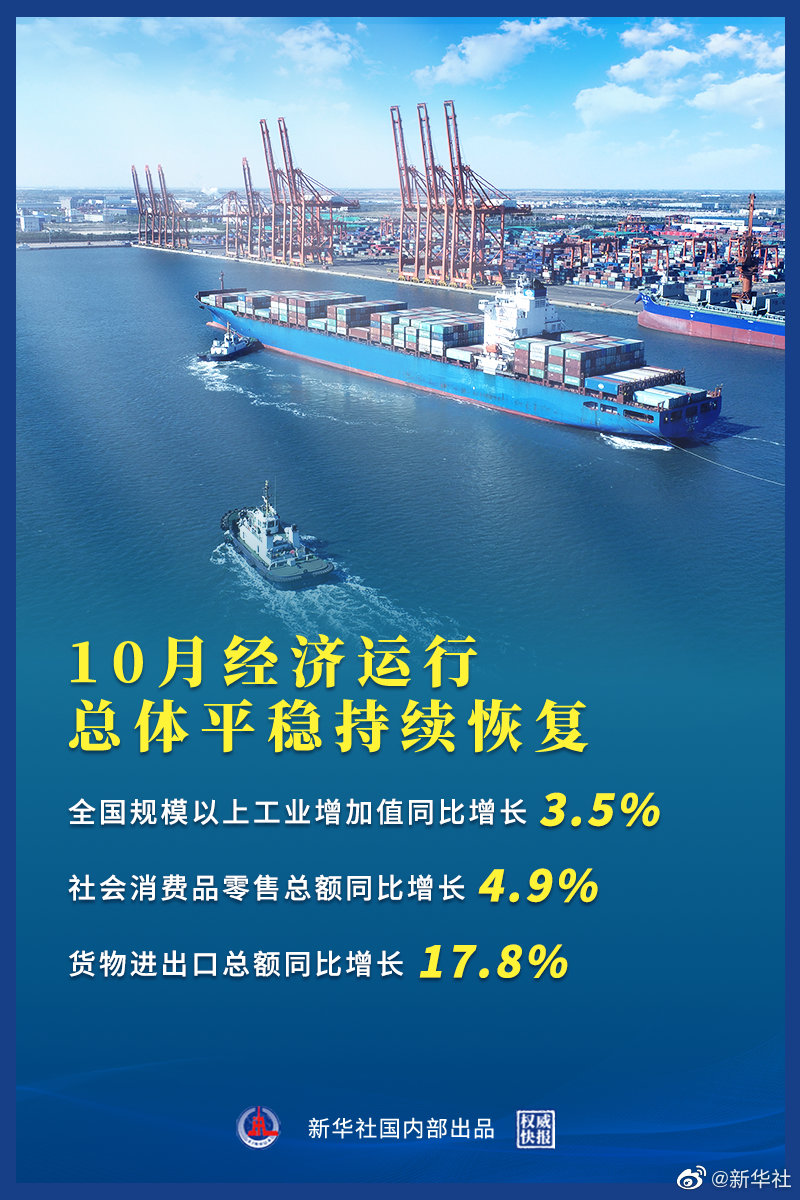 国家统计局15日发布的数据显示,10月份,全国规模以上工业增加值同比增长3.5%,两年平均增长5.2%;社会消费品零售总额40454亿元,同比增长4.9%,两年平均增长4.6%;货物进出口总额33357亿元,同比增长17.8%。国民经济延续稳步恢复态势,继续彰显韧性和活力。(记者魏玉坤、王雨萧,海报设计杨轶群)