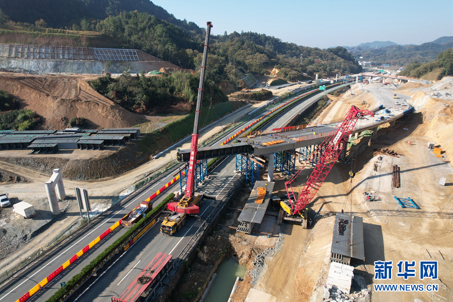 11月12日,航拍黄千高速呈村降枢纽互通B、C匝道跨杭瑞高速四联钢箱梁架设。