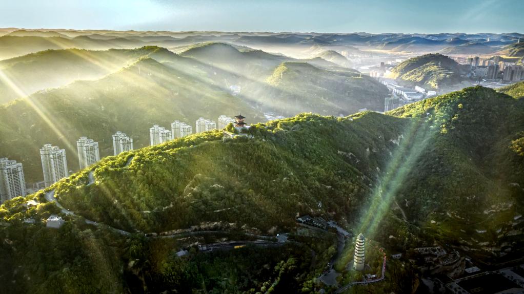 航拍被绿色环绕的延安市宝塔山。新华社记者 陶明 摄