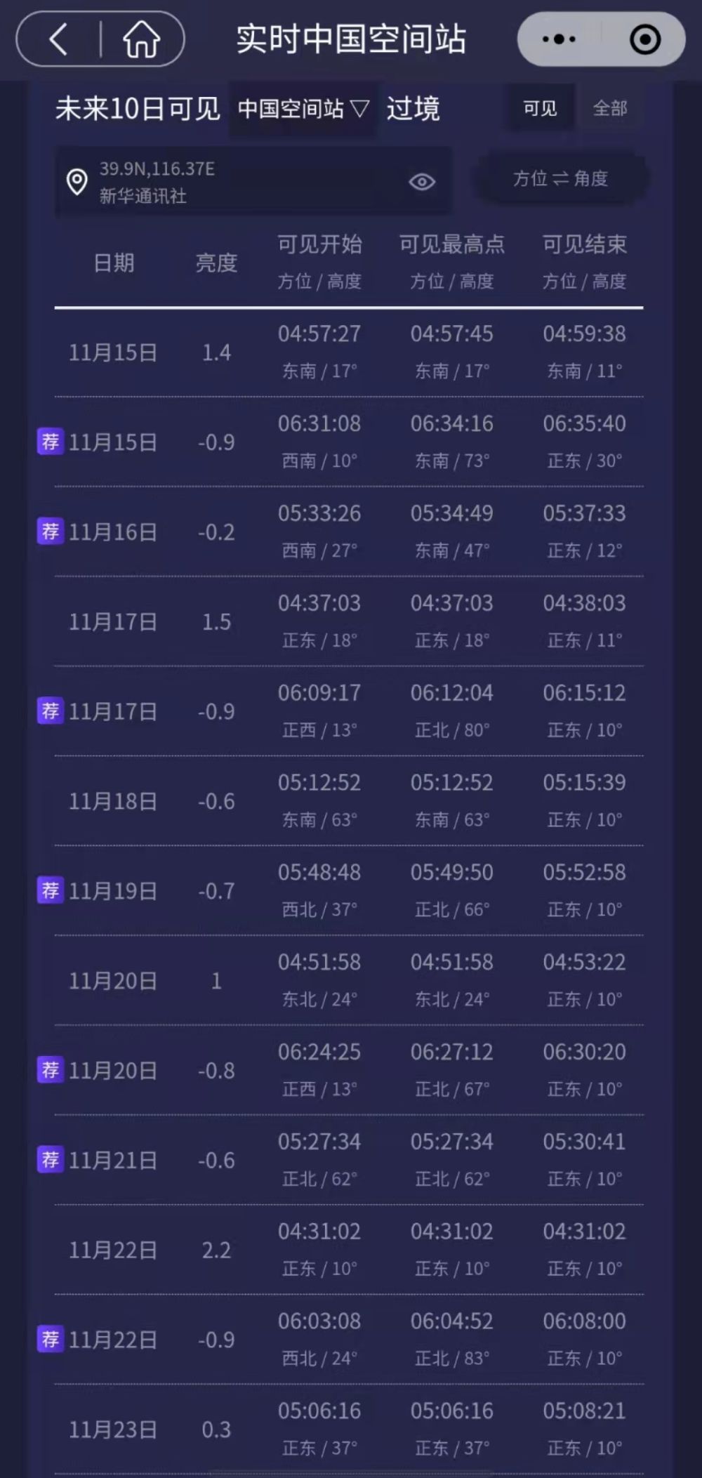 看到空间站的时间,有一个复杂的计算过程,我也看不懂,最简洁的办法,就是使用一个叫“天文通”的微信小程序,里面有一个链接,就可以看到自己所在地,能看到空间站的时间和方位。