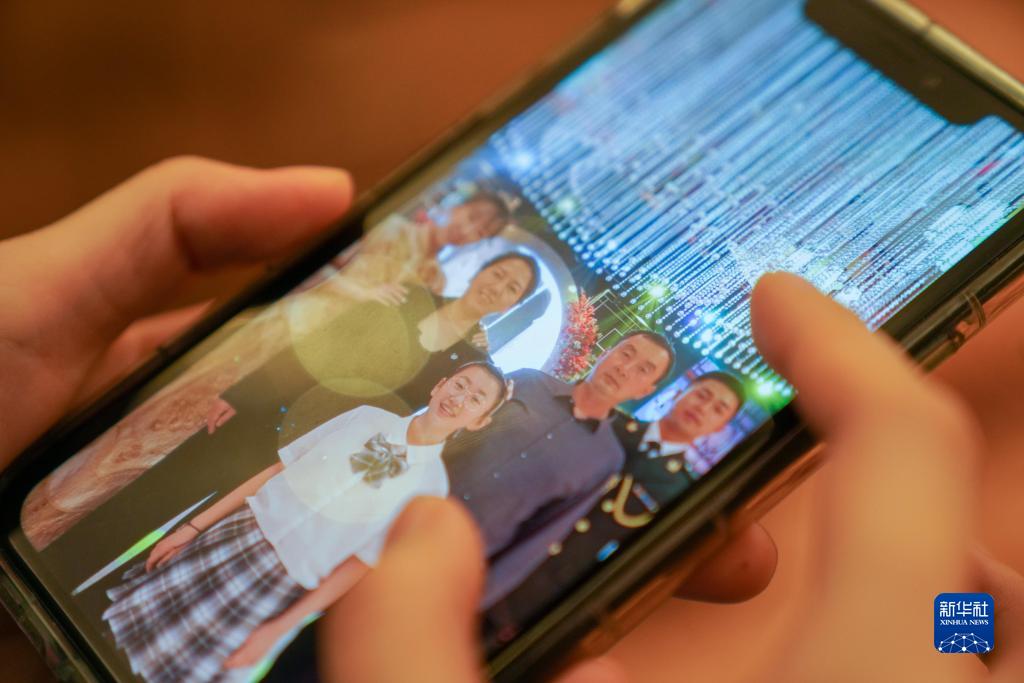刘冰在“火眼”移动方舱实验室驻地端详手机中家人照片(11月14日摄)。