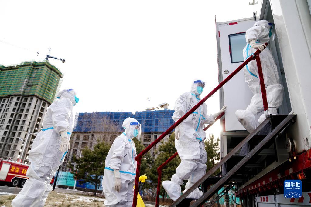 刘冰(左二)进入“火眼”移动方舱实验室(11月15日摄)。