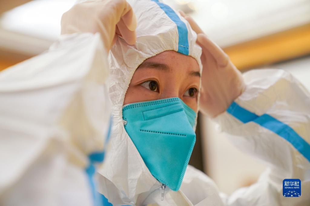 刘冰在“火眼”移动方舱实验室驻地更换隔离服(11月14日摄)。