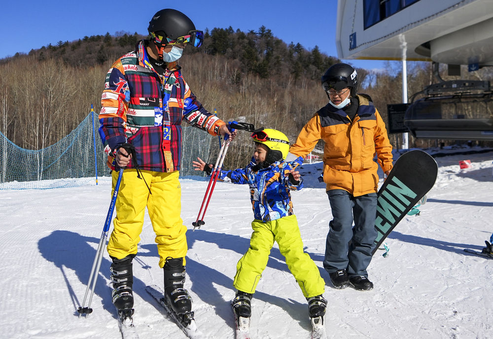 ↑在长白山国际度假区滑雪场滑雪,一名小朋友在家长带领下体验滑雪(11月15日摄)。新华社记者 许畅 摄