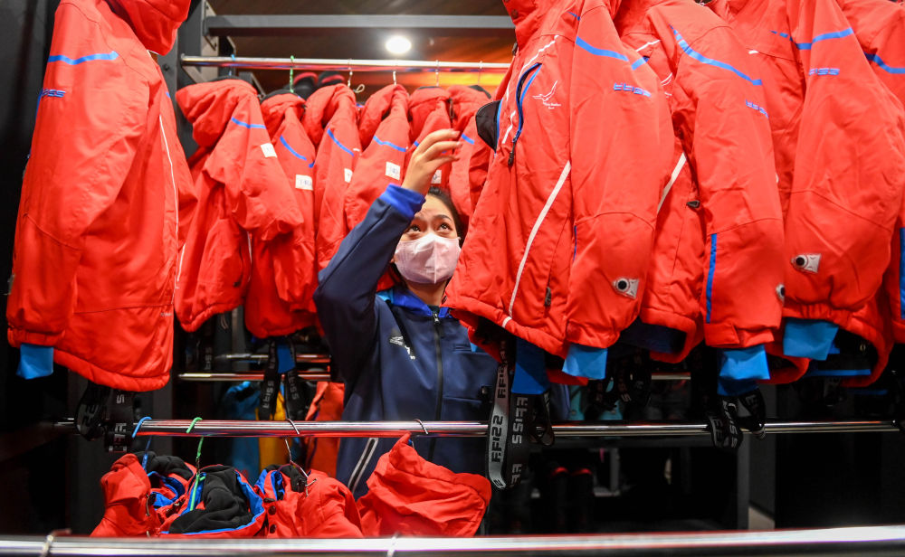 ↑工作人员在长白山国际度假区内整理滑雪服(11月15日摄)。新华社记者 颜麟蕴 摄