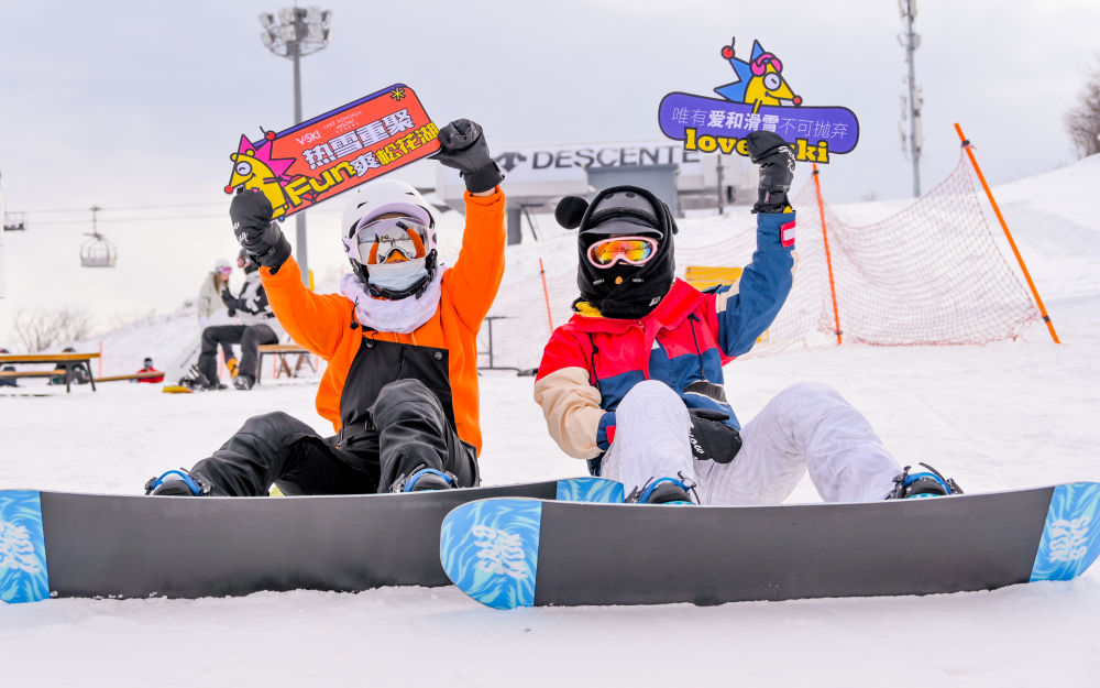 ↑滑雪爱好者在万科松花湖度假区滑雪场庆祝“开板”(11月14日摄)。新华社发